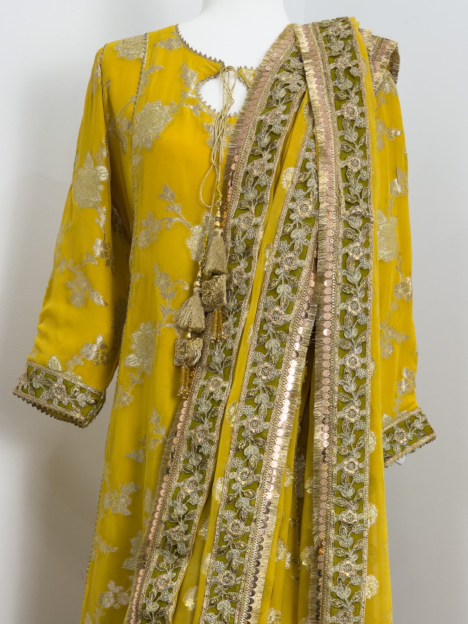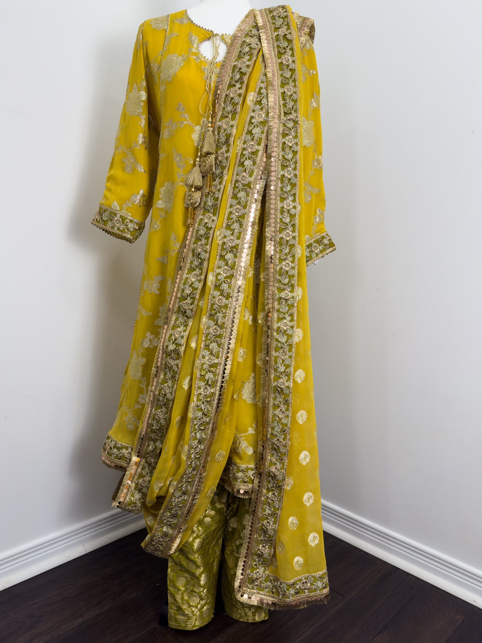 This stunning ensemble features a luxurious crepe top adorned with intricate golden woven embroidery and delicate gold lacing, complemented by a sophisticated pair of jacquard gold pants. The lightweight organza dupatta, beautifully detailed with all-over lacing, drapes gracefully, enhancing the overall elegance.